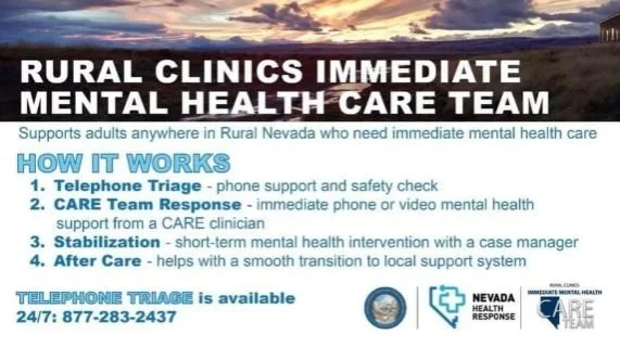 Do you need immediate mental health help and aren’t sure where to go? The CARE Team for adults is a State sponsored resource for rural Nevadans that connects you to a mental health professional immediately. The mental health professional can help stabilize mental health symptoms including grief, loss, depression, anxiety. They can also help connected you to on-going services in your community. Insurance will be billed if possible but there is never any cost for the caller.